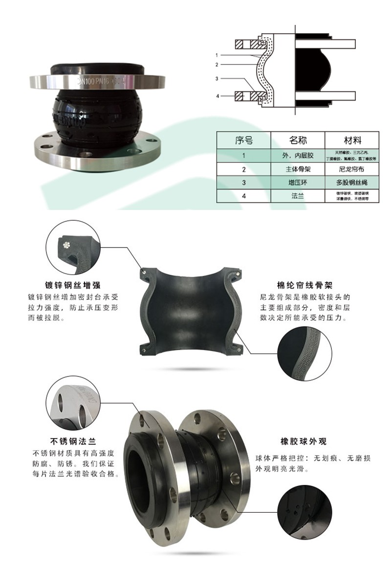 raybet网投一般由内胶层、织物增强层(帘子布)、中胶层、外胶层、端部加固金属环或钢丝圈,经高温、高压硫化成型后,与金属法兰或平行接头松套组合而成的复合橡胶管,其使用寿命取决于帘子布的质量。